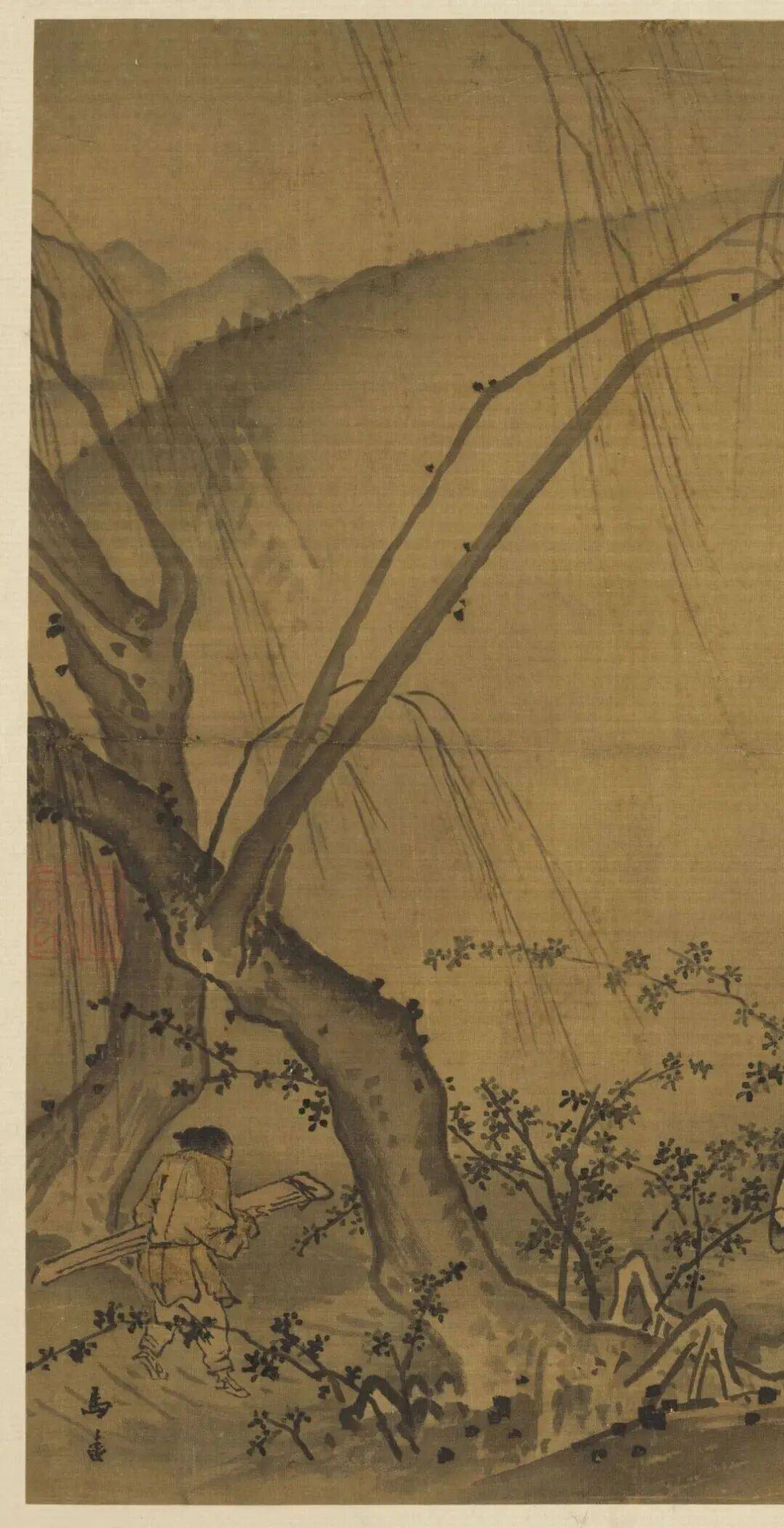 画面里,一高士捋着胡子,白袍飘飘,带着琴童在山径上溜达。溪边柳树抽新芽,两只黄莺在枝头“对山歌”,结果被高士的衣袖一拂,野花乱颤,鸟都吓跑了——这动态细节,比现代短视频还抓马!马远用“大斧劈皴”画山石,棱角硬得像刀削,可柳枝却柔得能滴出水,刚柔并济,活脱脱南宋版“反差萌”。