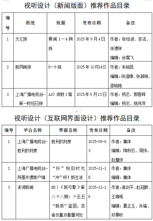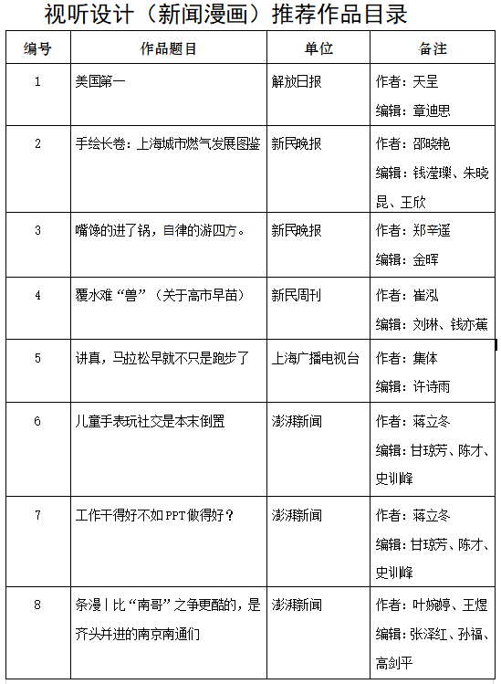 经新闻单位推荐、评选会评议表决,下列14件作品拟报送参加第三十六届中国新闻奖视听设计(新闻漫画、新闻版面、互联网界面设计)作品初评,现予以公示,至5月7日止。如有意见,可向上海新闻奖评奖办公室书面反映。